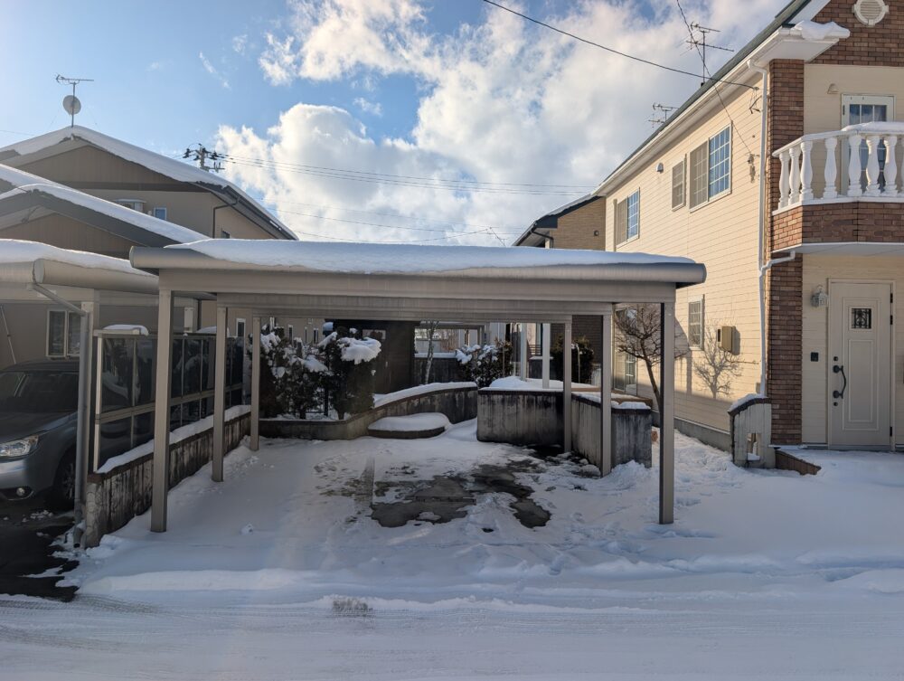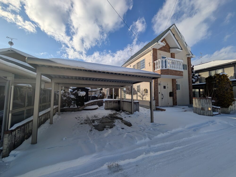 • 外観 屋根付きカーポートで積雪時も安心。前面道路付きで車の出入りもスムーズ。冬季も快適に使える外構です。