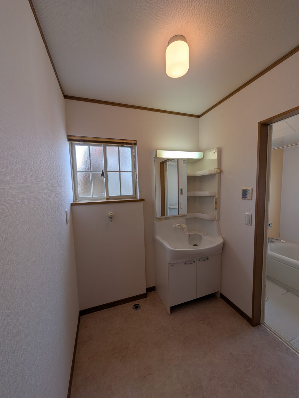 • 洗面所 鏡・照明・収納棚付きの洗面台。洗濯機置場もあり、浴室とつながる家事動線がスムーズな空間です。