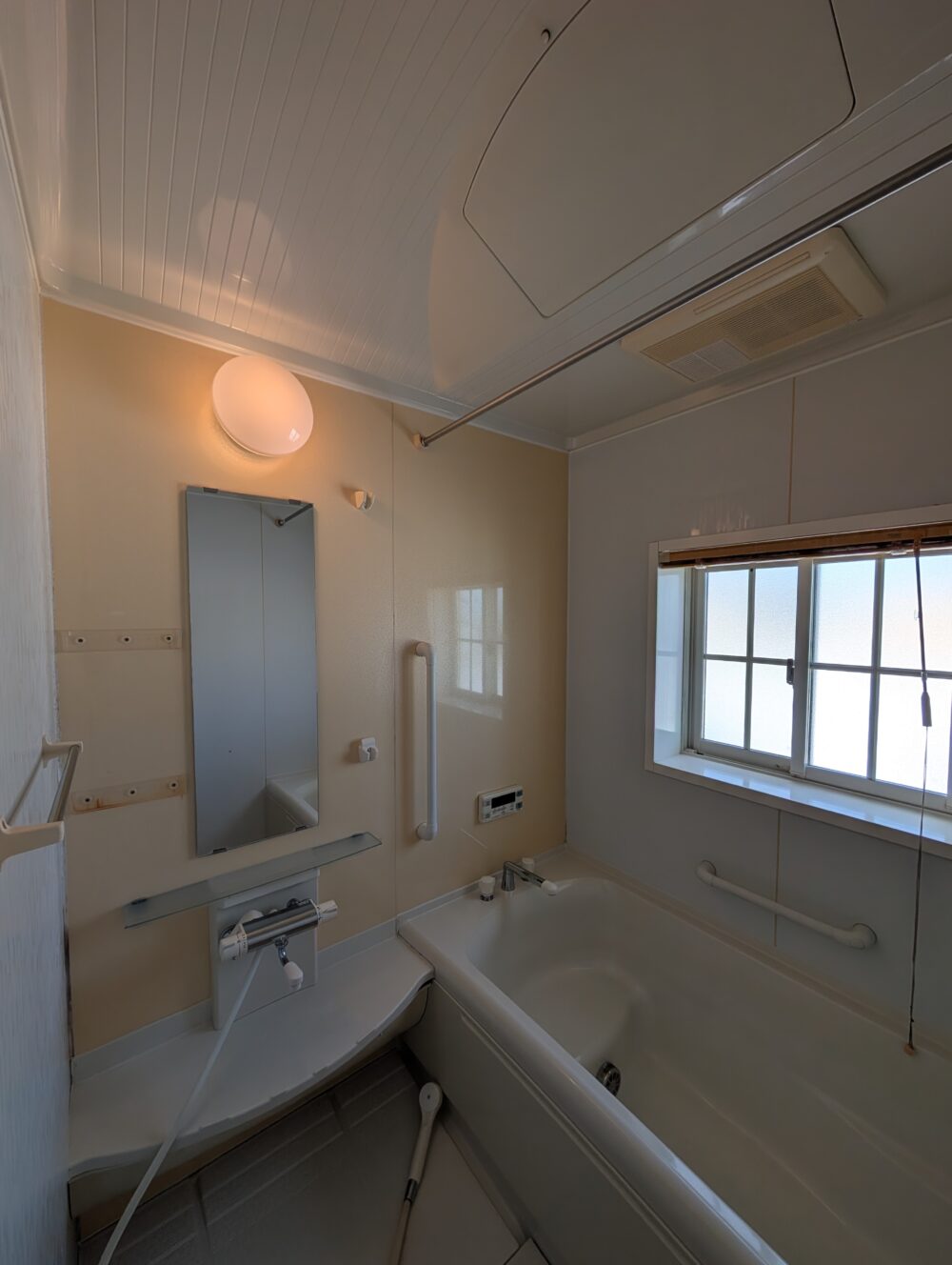 • 浴室 深型浴槽と手すり付きで安心な浴室。鏡・照明・操作パネル・換気設備も整い、機能的な空間です。