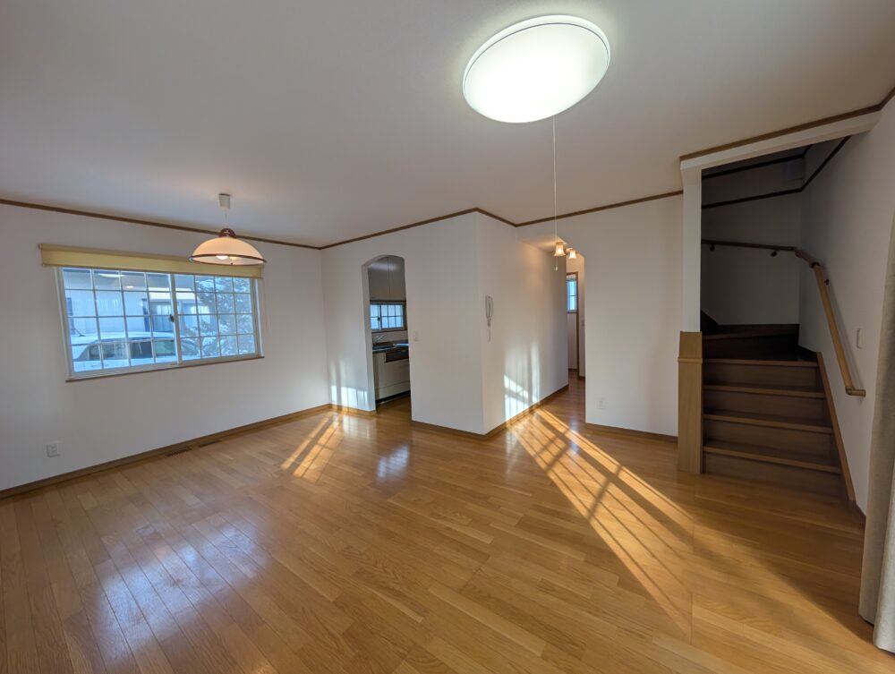 • リビング 複数の窓から光が差し込む明るいLDK。階段・廊下・キッチンが一体となった開放的な空間です。