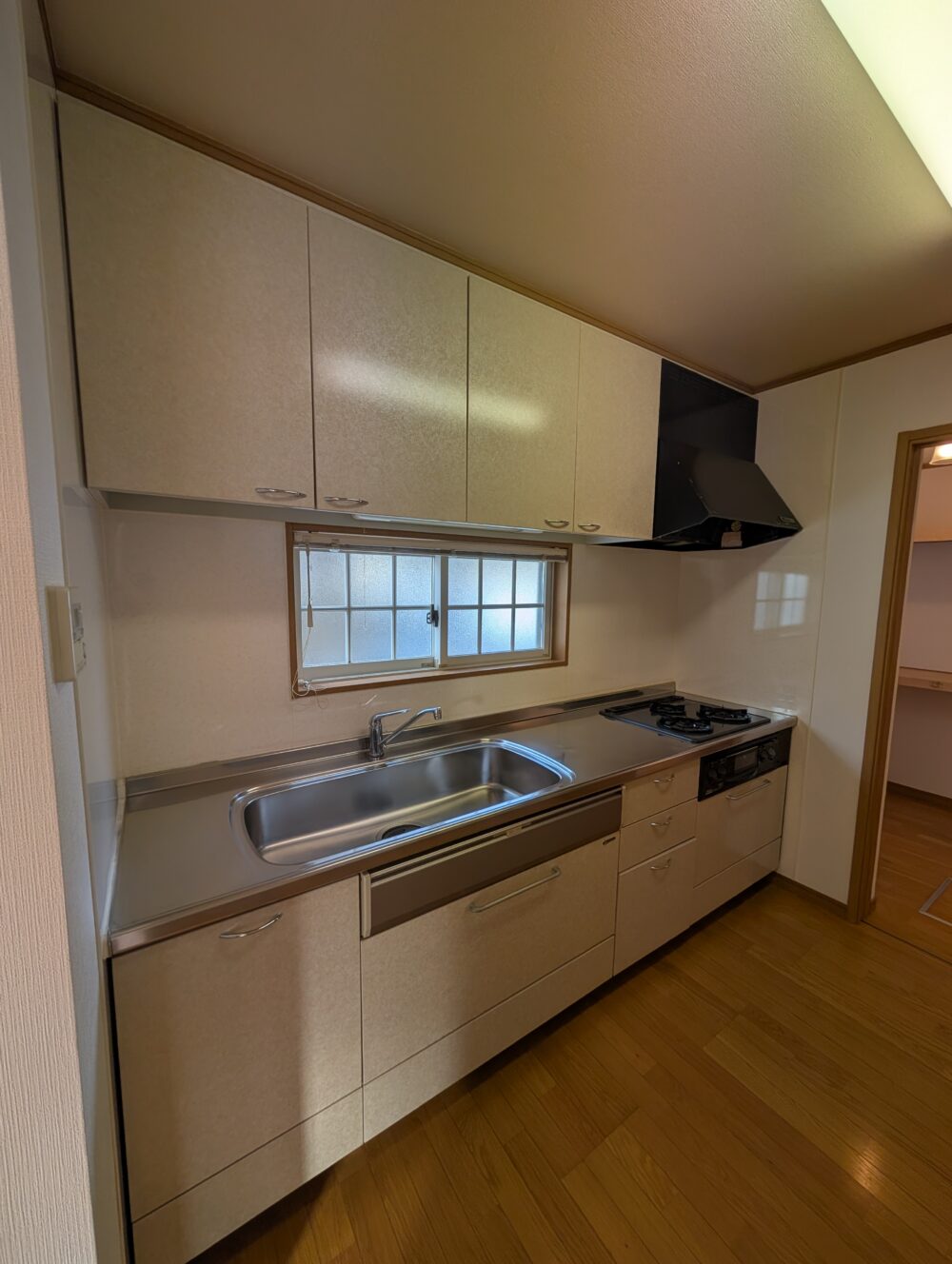 • キッチン ステンレスシンクと3口コンロが並ぶコンパクトキッチン。上下収納も充実し、自然光が差し込む明るく清潔感のある空間です。