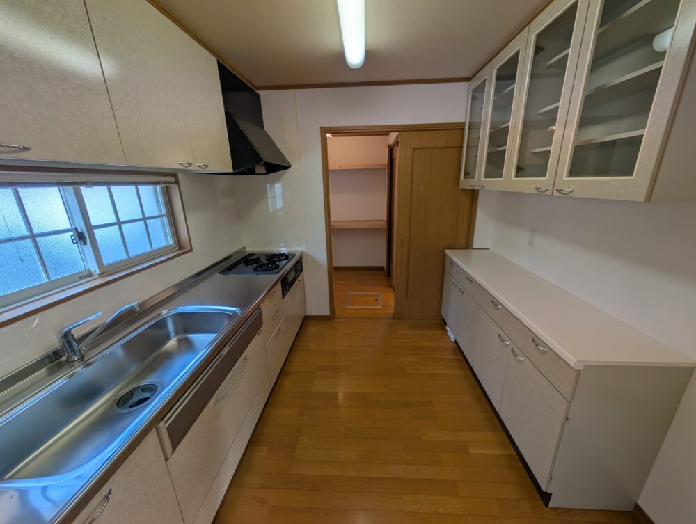• キッチン シンク・コンロ・作業台がU字型に配置された機能的なキッチン。上下収納が豊富で、奥にはパントリーもあり、家事動線がスムーズです。