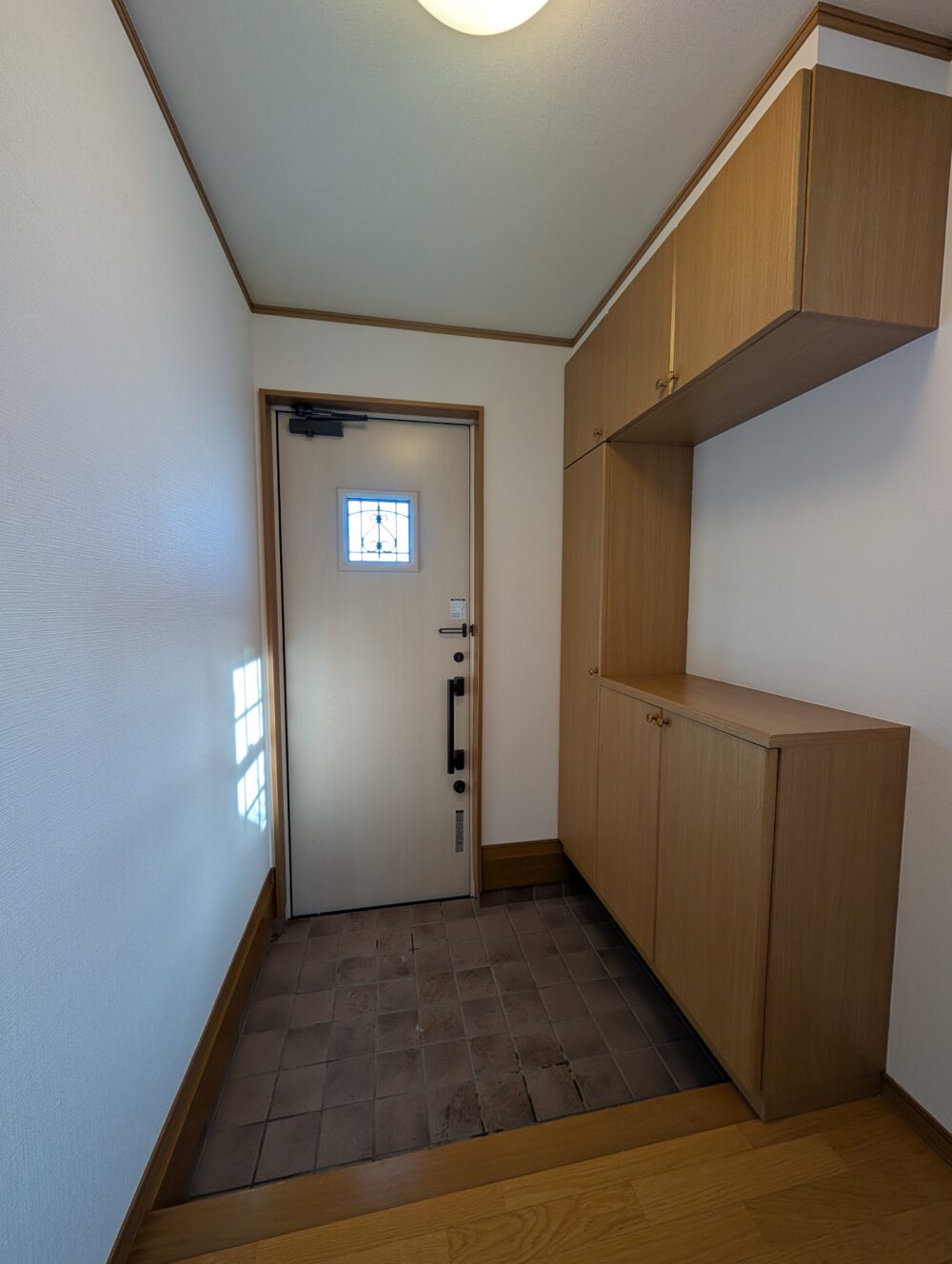 • 玄関 木製扉とタイル床が調和した清潔感ある玄関。上下収納付きで靴の整理も快適です。