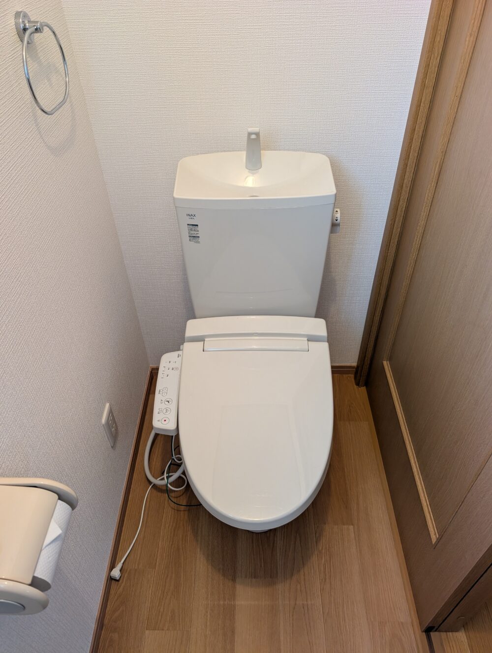 • トイレ 温水洗浄便座・手洗い付きタンクで快適なトイレ空間。木目床と白壁が調和し、清潔感も◎。