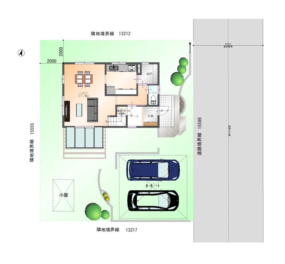 • カーポート 屋根付きカーポートで積雪時も安心。前面道路付きで車の出入りもスムーズな外構です。